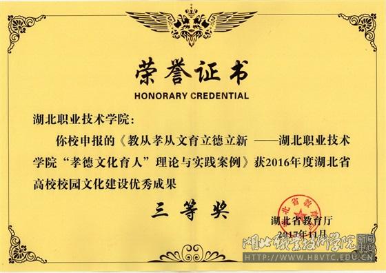 我校选送的《教从孝从文 育立德立新——幻影注册大厅_幻影(中国)“孝德文化育人”理论与实践案例》荣获湖北省2016年度高校校园文化建设优秀成果三等奖;《建“红网” 育“网红”——幻影注册大厅_幻影(中国)网络文化育人工作经验交流材料》入选2016年湖北省高校校园文化建设优秀成果集。