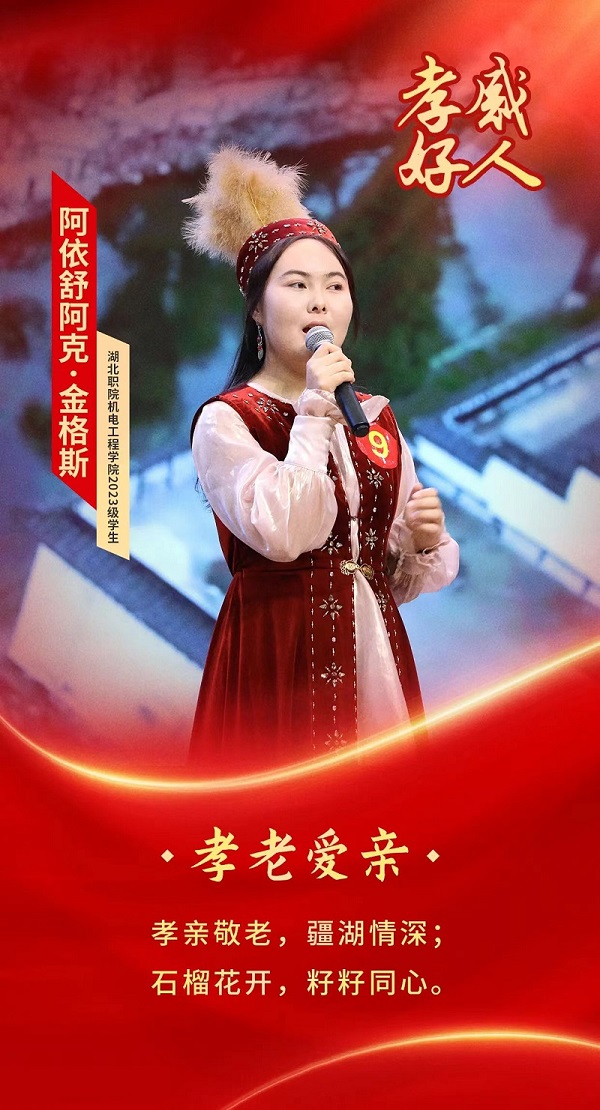 入校以来,阿依舒阿克积极参加湖北职院孝文化基地、廉洁文化基地、简牍文化基地、石榴红·孝廉谷文化基地的活动,积极组织“以孝文化为坐标开展感恩教育”“孝铸共同体”“非遗节”“体荟共同体”“道德模范讲英雄故事”等活动。作为荆楚石榴红志愿服务队副主席,她组织开展“政策理论宣讲”“敬老爱老助老”“扶弱助残支教”等志愿服务项目群,深入社会福利院、养老院、光荣院、社区开展志愿服务活动,为老人们带去敬意和欢乐。她积极为全校各民族学生提供优质服务,把铸牢中华民族共同体意识播撒在各民族同学的心田。她技能成才,2025年7月获2025湖北省职业院校技能大赛二等奖。