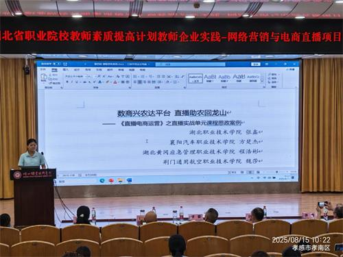 (本网讯 肖敏晨 毛婷 马江浩 王峰 李蓓蕾 李媛 汪行光 宋巍)8月15日,湖北省2025年职业院校教师素质提高计划教师企业实践——网络营销与电商直播项目学习成果展示暨结业式在西区文博馆学术报告厅举行,校党委委员、副校长杨立明出席并讲话,授课专家代表黄享苟、我校继续教育学院院长丁浙英、财经与旅游学院党总支书记徐斌华等以及60名参训学员共同见证活动。活动由财经与旅游学院院长曹艳芬主持。