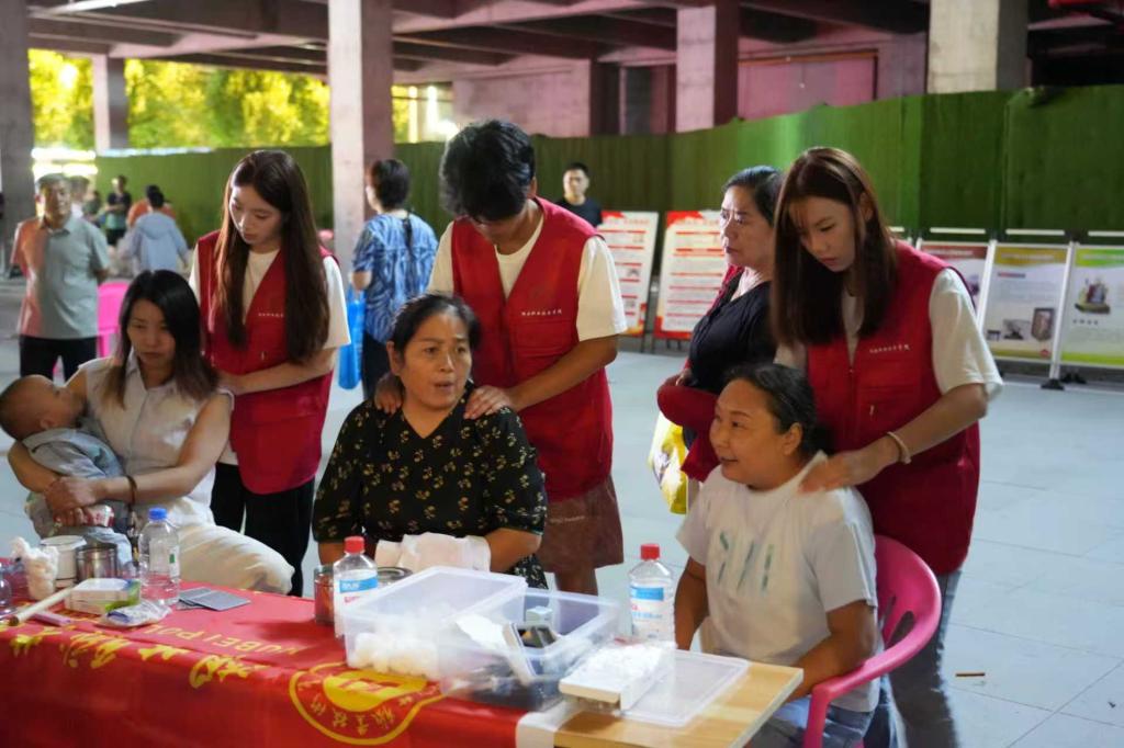 针对居民常见的颈肩腰腿痛问题,志愿者们运用专业的推拿手法为居民按摩放松。他们沿着居民的肩颈肌肉纹理轻轻按压、揉捏,缓解肌肉紧张;对于疼痛明显的部位,还配合拔罐疗法,促进局部血液循环,减轻酸痛感。“按压的时候有点酸胀,但按完之后特别舒服,肩膀一下子轻松了!”刚体验完按摩的李爷爷满意地说。