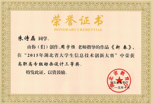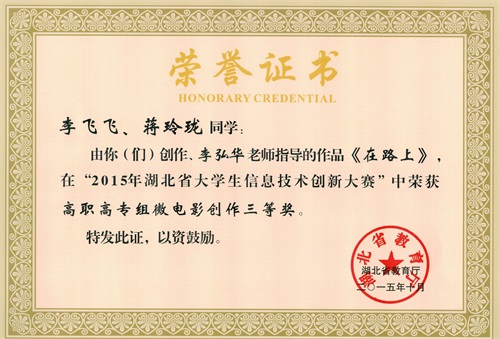 10月27日,2015年湖北省大学生信息技术创新大赛评选结果揭晓,我校选送的作品获二等奖2项、三等奖2项。其中,物流学院学生王意创作、肖敏晨老师指导的微电影《尚好的青春》,信息技术学院学生靖泽宽、陈鑫设计、王亮老师指导的移动终端软件创新设计作品《打地鼠》分别荣获二等奖;汽车学院学生朱诗磊创作、周宇恒老师指导的FLASH动画短片《新春》,护理学院学生李飞飞、蒋玲珑创作、李弘华老师指导的微电影《在路上》分别荣获三等奖。