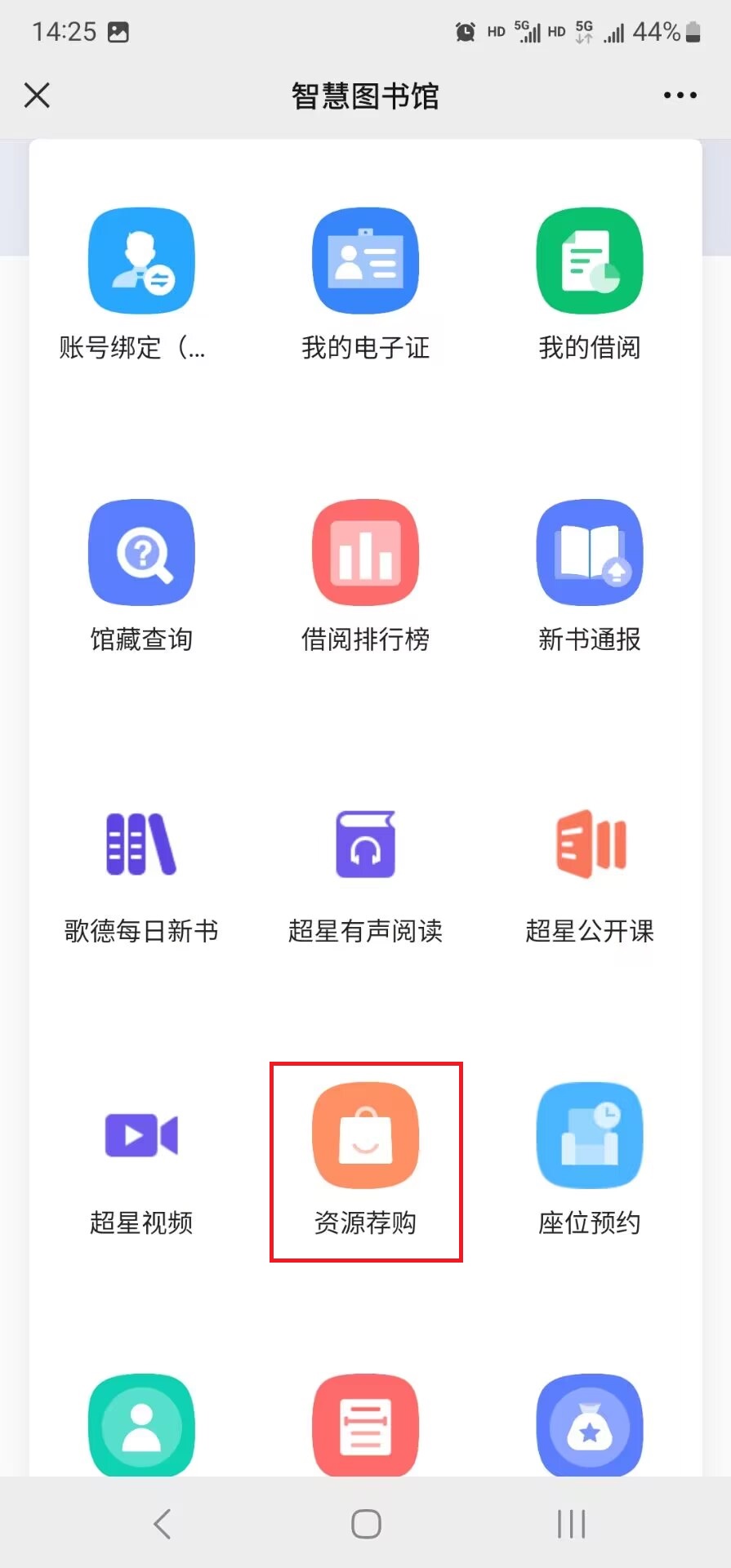 (2)打开【智慧图书馆】栏目→【帐号绑定】绑定学号、工号→【资源荐购】进入应用