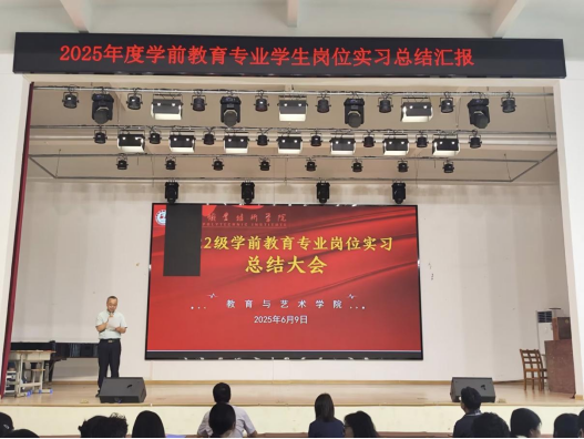 (本网讯 罗小红)6月9日,卧龙校区学生活动中心内气氛热烈,2025年春学前教育专业岗位实习总结汇报大会在此隆重举行。教育与艺术学院班子成员、教学办、学工办相关负责人、全体22级返校实习学生及实习指导教师齐聚一堂,共同见证实习学子的成长蜕变,分享教育实践的温暖与收获。