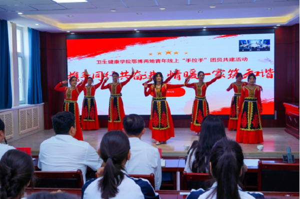 交流互动阶段。两校团员青年通过腾讯云端表演节目,博尔塔拉职业技术学院卫生健康学院带来活力四射的民族舞蹈《白马》和《绽放》,医学院团员青年献上深情合唱节目《如愿》,双方还共同观看了两校宣传片。