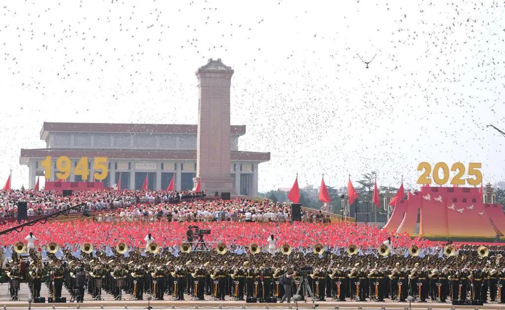 (9月3日,纪念中国人民抗日战争暨世界反法西斯战争胜利80周年大会在北京隆重举行。这是纪念大会现场放飞鸽子。新华网)